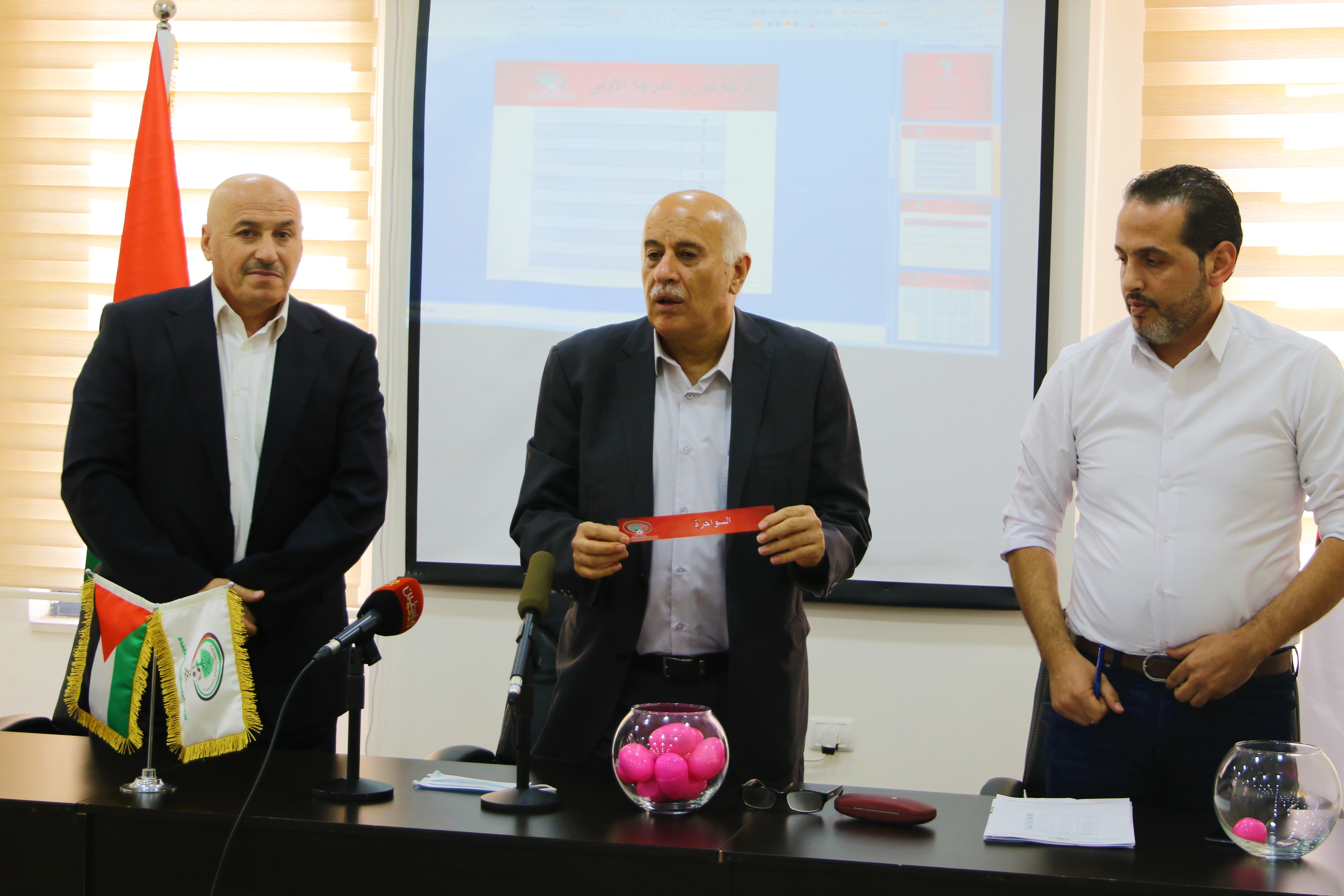 القدس 20-9-2021 وفا- سحب رئيس الاتحاد الفلسطيني لكرة القدم الفريق جبريل الرجوب، اليوم الاثنين، في مقر الاتحاد بالرام، قرعة دوري الاحتراف الجزئي للموسم 2021-2022، بحضور عضو المكتب التنفيذي، رئيس لجنة المسابقات العامة بالاتحاد صلاح الجعبري، وأمين عام الاتحاد فراس أبو هلال، ورؤساء الأندية المشاركة.