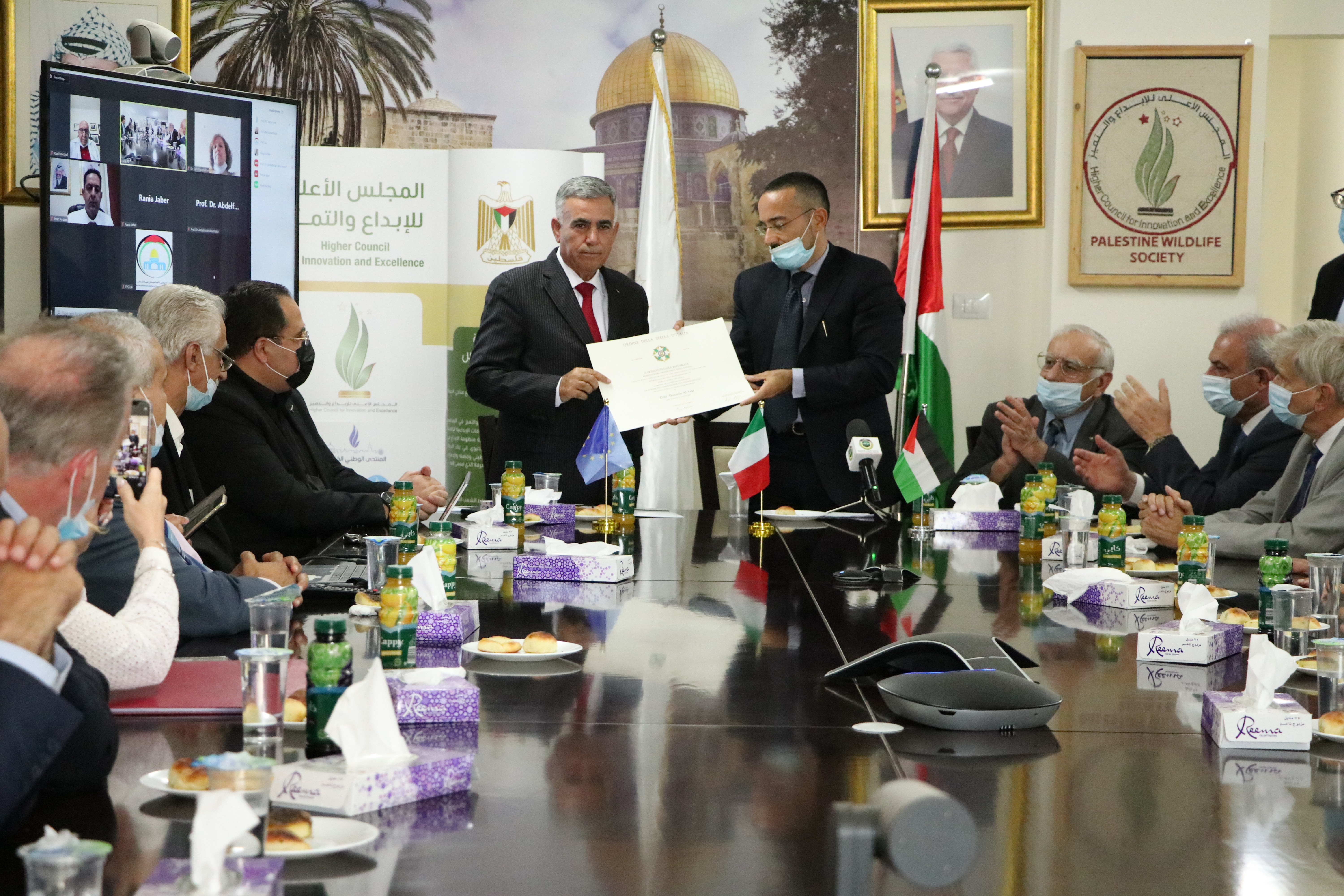 جاء التكريم في حفل أقيم بمقر المجلس، بمدينة رام الله، بحضور طاقم من القنصلية الإيطالية، ومدير الوكالة الإيطالية للتعاون الإنمائي في القدس جويلمو جوردانو، وممثل الرئيس محمود عباس، نائب رئيس الوزراء زياد أبو عمرو، ورئيس المجلس الأعلى للإبداع والتميز عدنان سمارة، وبحضور عدد من الشخصيات الاعتبارية.