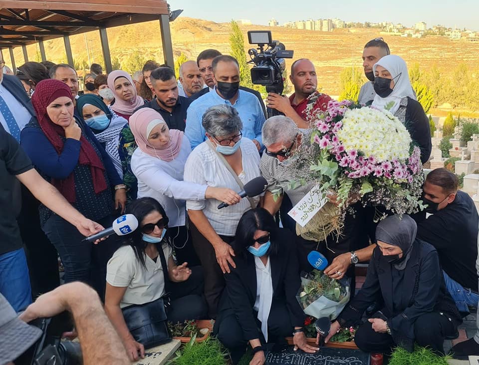 رام الله 26-9-2021 وفا- وضعت الأسيرة المحررة خالدة جرار، مساء اليوم الأحد، إكليل ورود على ضريح ابنتها سهى، التي وافتها المنية قبل شهرين.