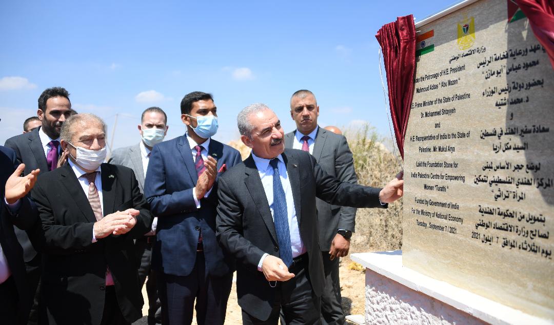 رام الله 7-9-2021 وفا- وضع رئيس الوزراء محمد اشتية، اليوم الثلاثاء، شمال رام الله، حجر الأساس لمركز تطوير المنتجات التراثية الفلسطينية "تراثي"، والممول من الحكومة الهندية.