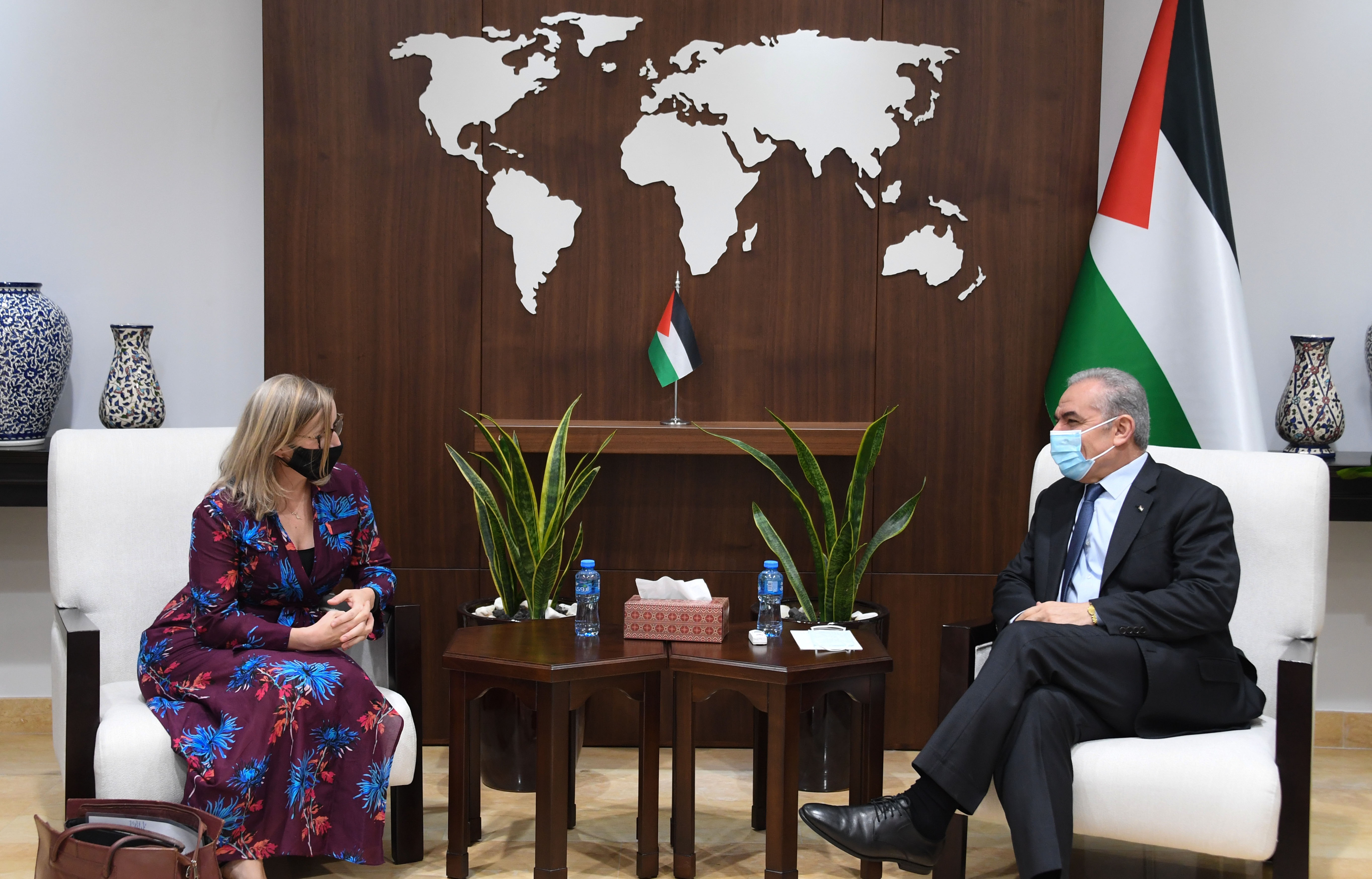 رام الله 8-9-2021 وفا- بحث رئيس الوزراء محمد اشتية، اليوم الأربعاء مع الممثل الكندي لدى دولة فلسطين السيدة روبن ويتلوفر، تعزيز التعاون المشترك، وأطلعها على آخر المستجدات السياسية.
