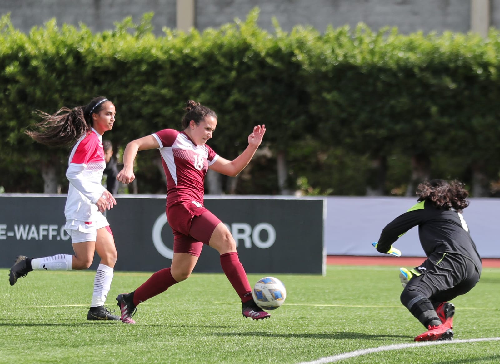 وفي الوقت الإضافي من عمر الشوط الأول، قلّصت واعدات فلسطين الفارق بهدف اللاعبة لين خوري.
