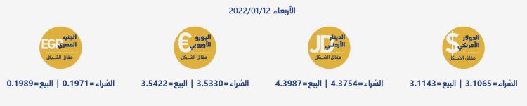 رام الله 12-1-2022 وفا- جاءت أسعار العملات مقابل الشيقل الإسرائيلي، اليوم الأربعاء، حسب سلطة النقد، على النحو التالي: