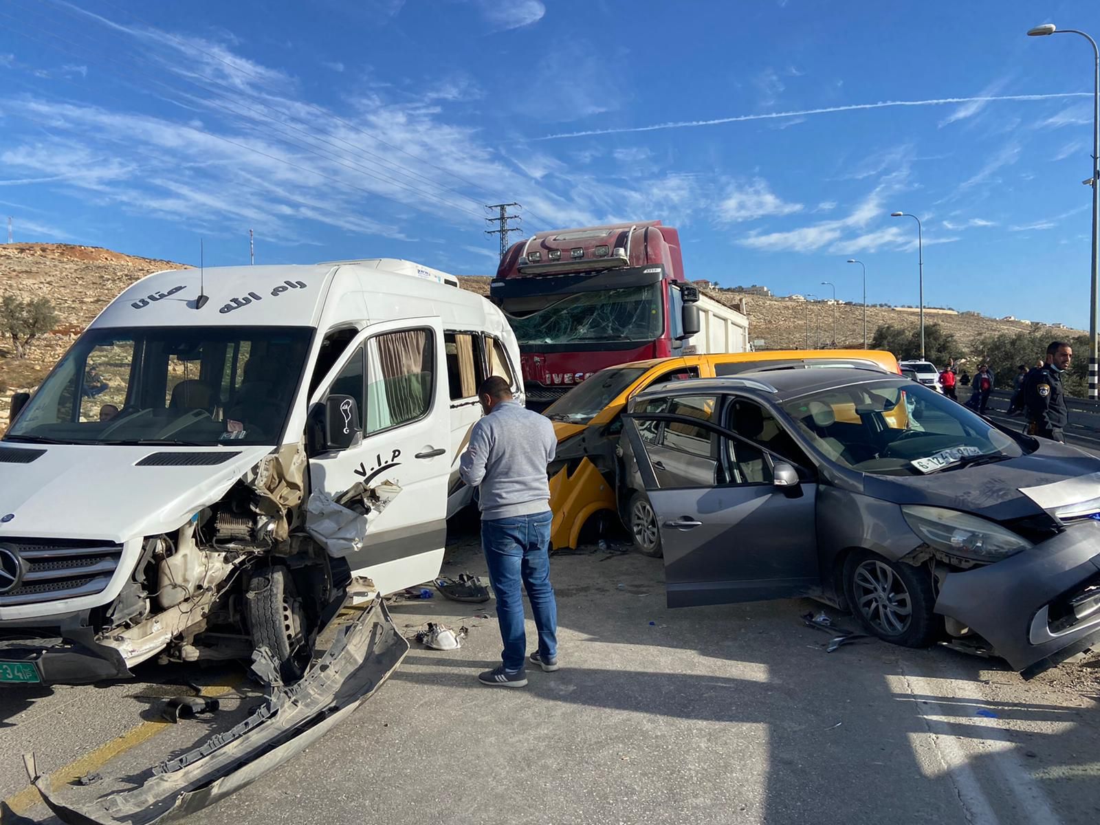 القدس 12-1-2022 وفا- أصيب 14 مواطنا، اليوم الأربعاء، إثر حادث سير وقع بين خمس مركبات على الشارع الواصل بين حزما وجبع، شمال شرق القدس.
