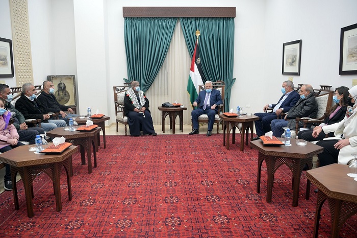 رام الله 12-1-2022 وفا- استقبل رئيس دولة فلسطين محمود عباس، مساء اليوم الاربعاء، المناضلة لطيفة أبو حميد، والدة الأسير البطل ناصر أبو حميد، وذلك في مقر الرئاسة بمدينة رام الله.