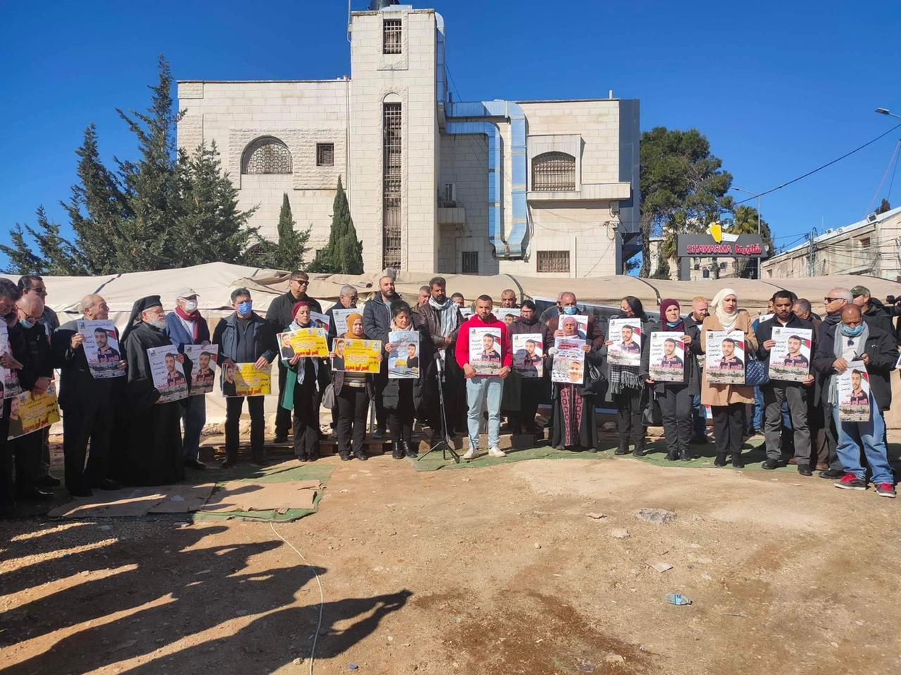 البيرة 18-1-2022 وفا- شارك عشرات المواطنين وممثلو مؤسسات الأسرى والقوى الوطنية، اليوم الثلاثاء، في وقفة إسناد للأسير المريض ناصر أبو حميد، في خيمة الاعتصام الدائم التي تقام أمام مخيم الأمعري في مدينة البيرة.