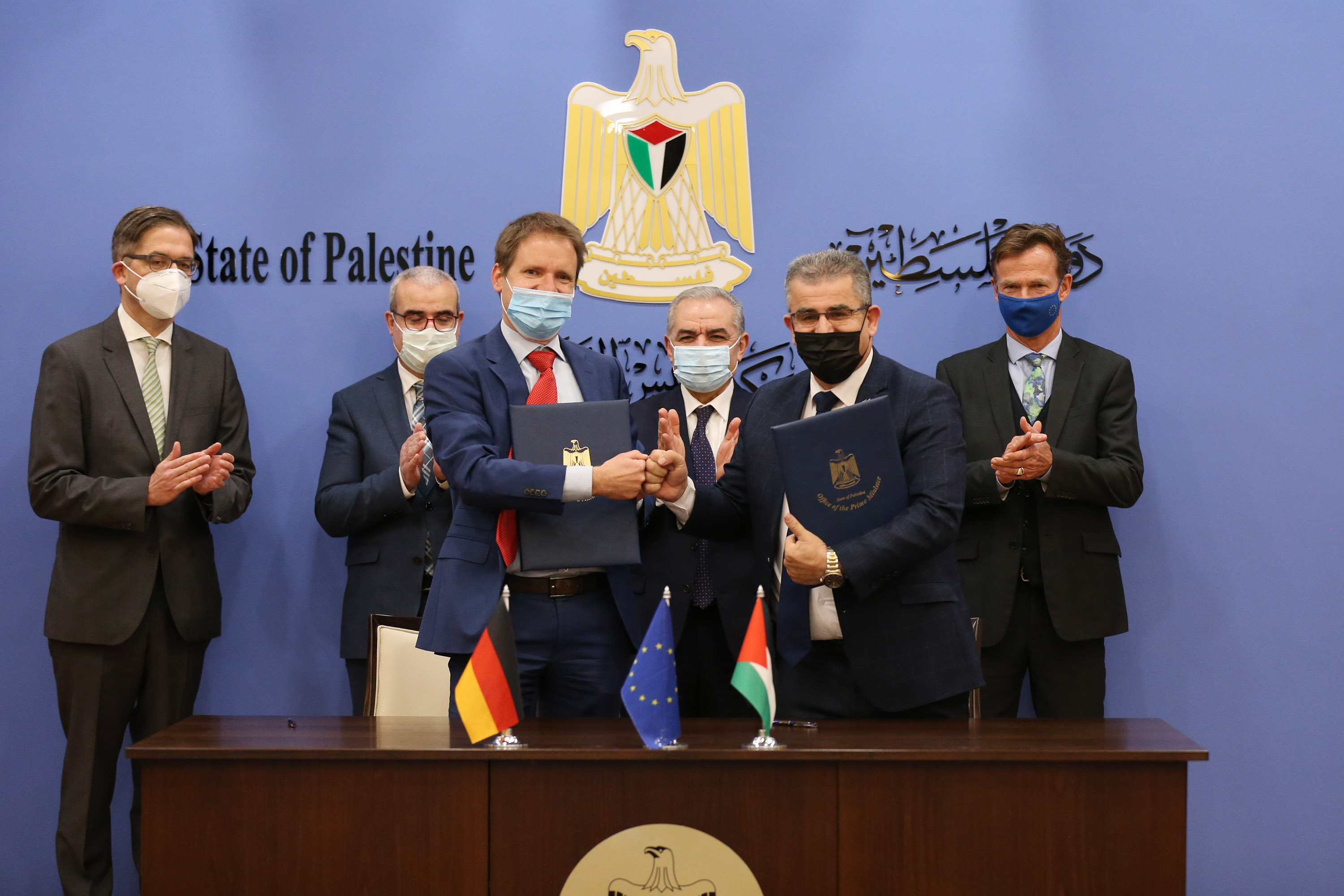 وجرى توقيع الاتفاقيات، اليوم الأربعاء، في مكتب رئيس الوزراء محمد اشتية بمدينة رام الله، برعايته وحضوره، لتعزيز الاقتصاد الفلسطيني ودعم الاستثمار في الطاقة المتجددة، ودعم وتمويل الشركات الصغيرة والمتوسطة المتضررة من جائحة "كورونا".