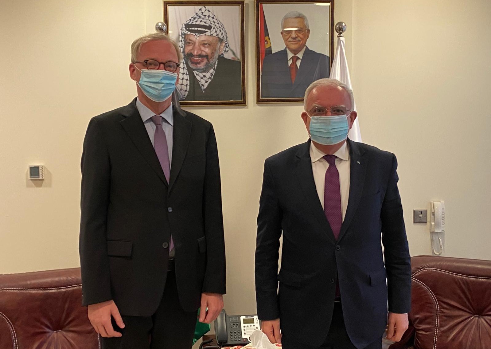 رام الله 26-1-2022 وفا- ودّع وزير الخارجية والمغتربين رياض المالكي، اليوم الأربعاء، رئيس مكتب تمثيل جمهورية التشيك لدى دولة فلسطين بيتر ستاري، بمناسبة انتهاء مهامه الرسمية.
