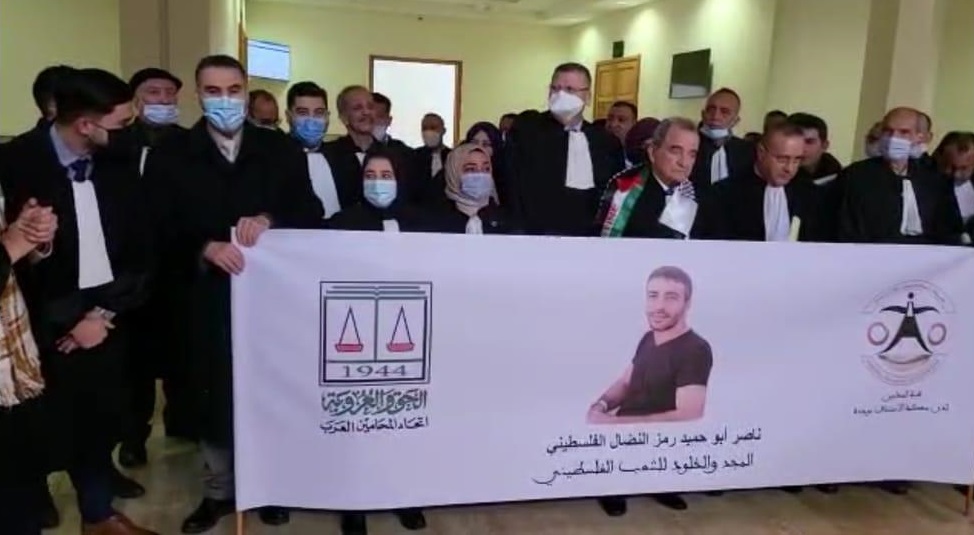 وجدة (المغرب) 28-1-2022 وفا- نظم اتحاد المحامين العرب وهيئة نقابة محامي مدينة وجدة المغربية وقفة تضامنية مع الأسير في سجون الاحتلال الإسرائيلي ناصر أبو حميد، الذي يعاني وضعا صحيا خطيرا.