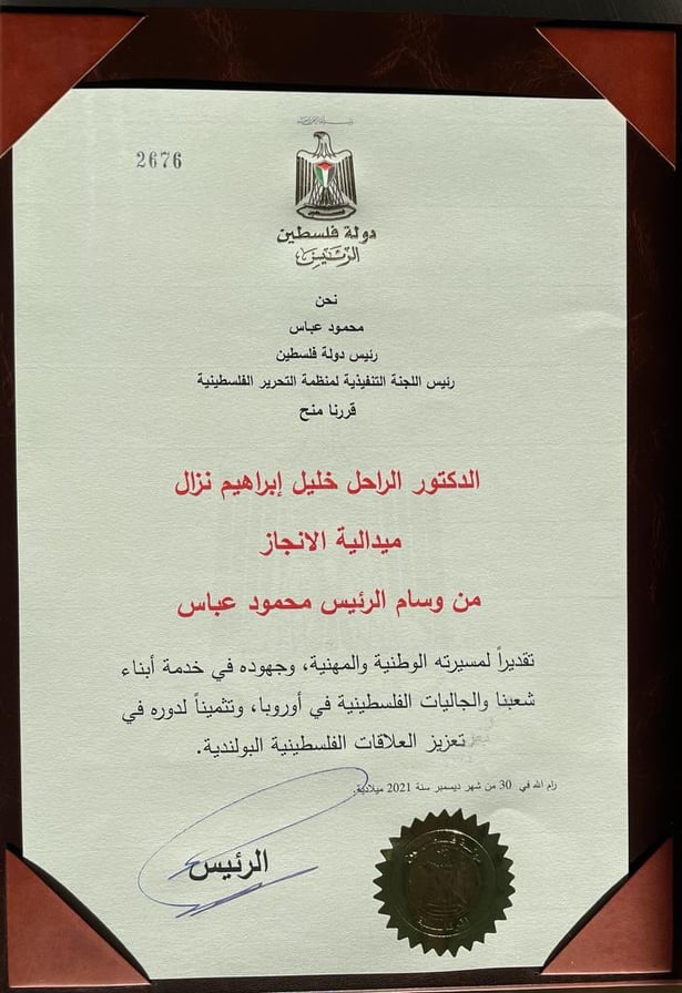 وباسم الرئيس محمود عباس، سلم سفير دولة فلسطين لدى بولندا محمود خليفة، ميدالية الإنجاز لزوجة الراحل، الدكتورة نجوى أبو ياسين، تقديراً لمسيرته الوطنية والمهنية، وجهوده في خدمة أبناء شعبنا، والجاليات الفلسطينية في أوروبا وتثمينا لدوره في تعزيز العلاقات الفلسطينية البولندية.