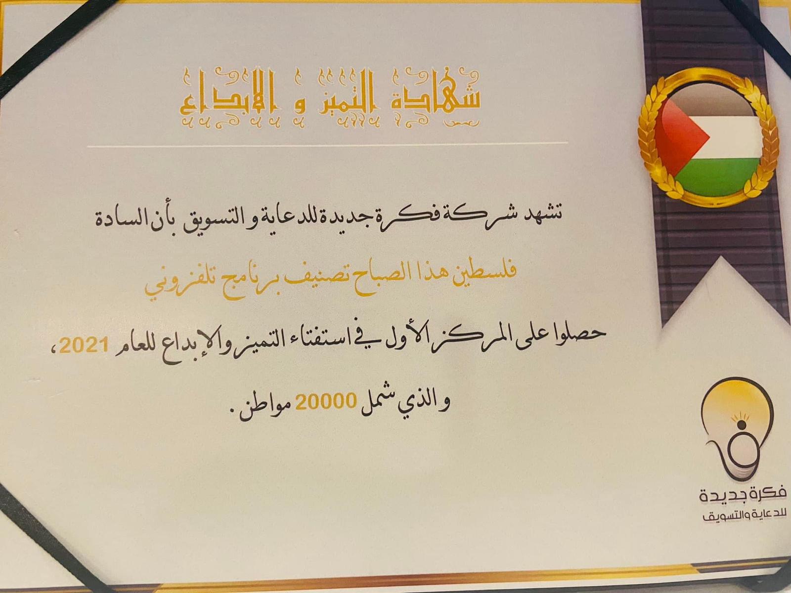 رام الله 5-1-2022 وفا- حصل برنامج "فلسطين هذا الصباح" الذي يبث عبر شاشة تلفزيون فلسطين، على المركز الأول على مستوى الوطن في استفتاء التميز والإبداع للعام 2021، والذي شمل 20 ألف مواطن.