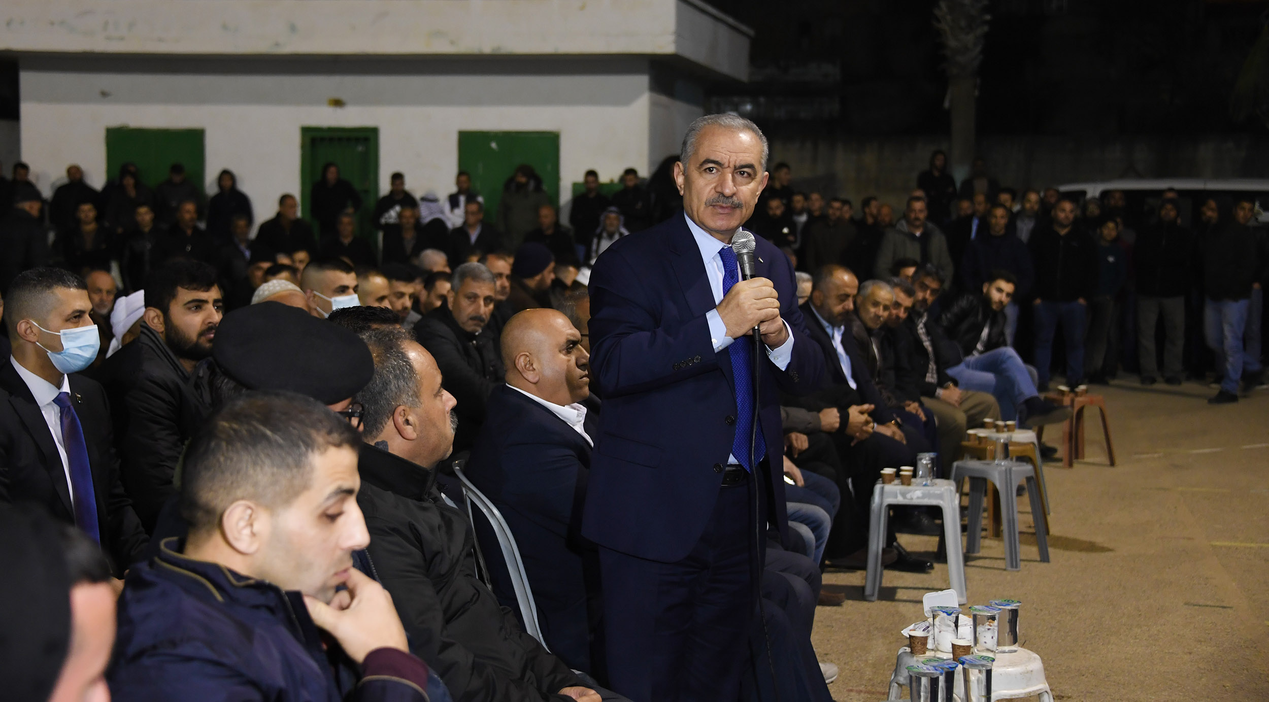 نابلس 7-1-2022 وفا- قدم رئيس الوزراء محمد اشتية، واجب العزاء لعائلات شهداء بلدة عقربا جنوب شرق مدينة نابلس، مساء اليوم الجمعة.