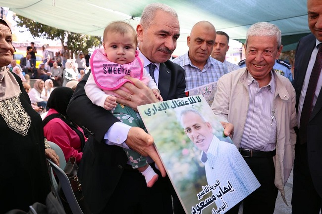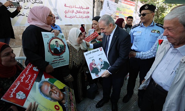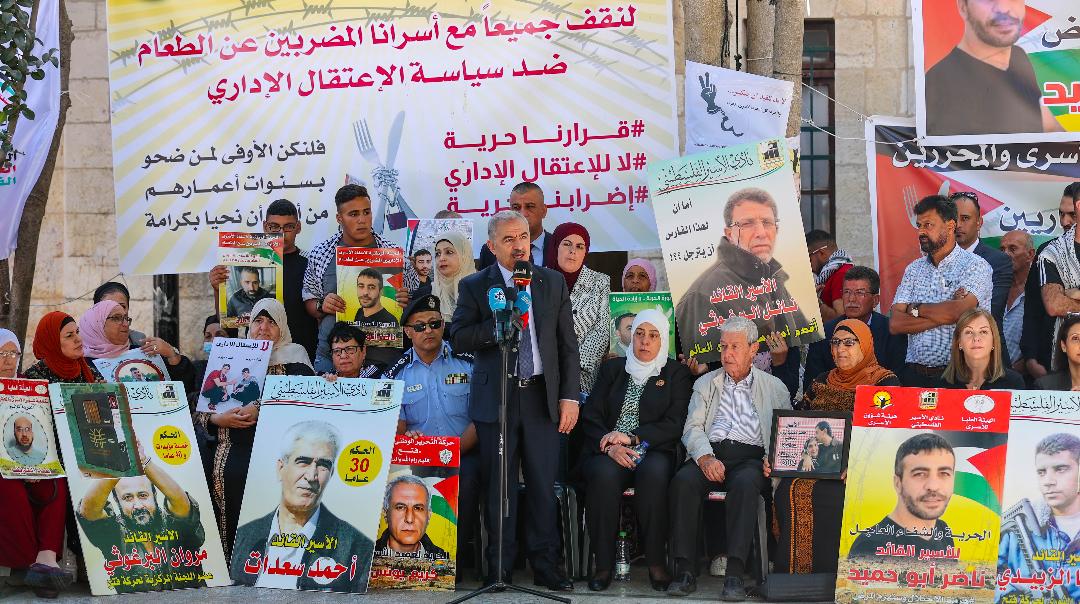 وقال رئيس الوزراء: "باسم السيد الرئيس محمود عباس الذي رفع صور الأسرى في أعلى منصة دولية في الأمم المتحدة، وبأعلى صوت قال لأم ناصر أبو حميد، أم الأسرى، وأهالي الأسرى والشهداء وكل الذين لهم دور في المشهد الوطني المتميز، إننا على العهد رغم كل ممارسات الاحتلال، وعقوباته بالحصار المالي، وسرقة الجغرافيا وتقتيل أهلنا، نتوجه بالتحية لأسرانا البواسل في سجون الاحتلال الذين هم ضمير شعبنا الفلسطيني وحركتنا الوطنية".