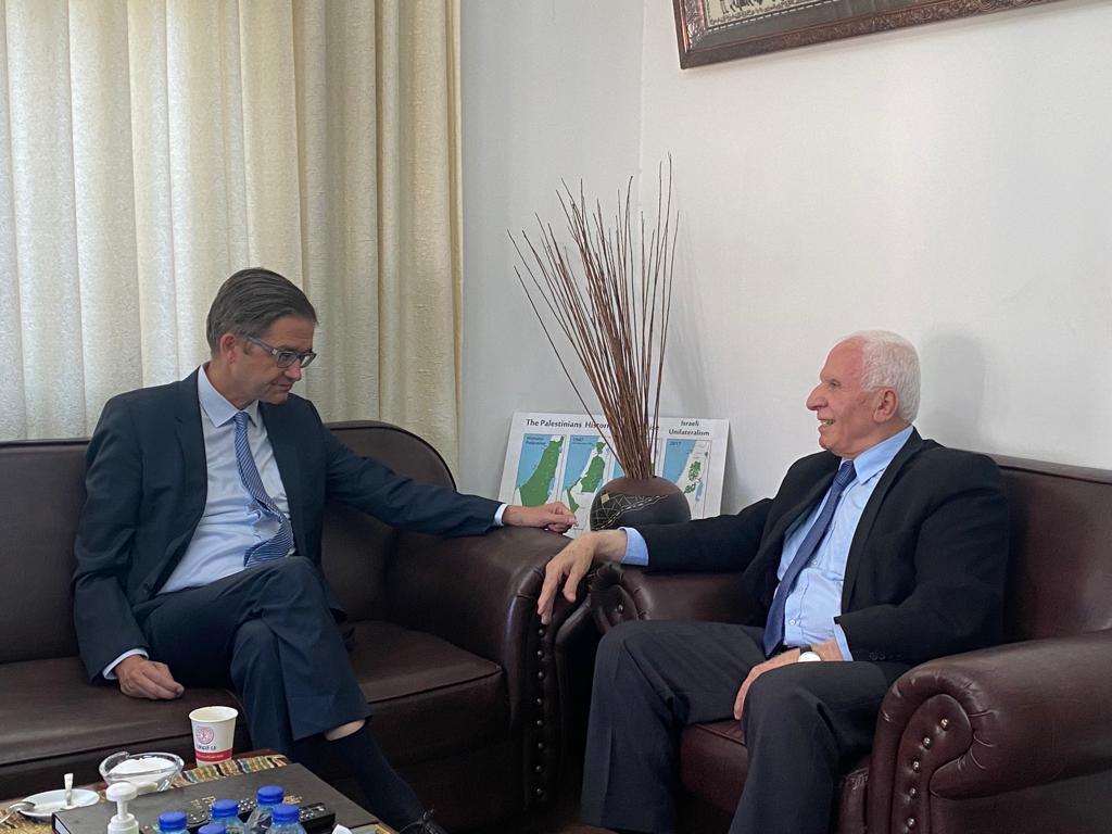 رام الله 17-10-2022 وفا- أطلع عضو اللجنتين التنفيذية لمنظمة التحرير الفلسطينية، والمركزية لحركة "فتح"، عزام الأحمد، ممثل جمهورية ألمانيا الاتحادية اوليفر اوفتشا على آخر المستجدات في الأراضي الفلسطينية.