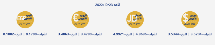 رام الله 23-10-2022 وفا- جاءت أسعار العملات مقابل الشيقل الإسرائيلي، اليوم الاحد، حسب سلطة النقد، على النحو التالي: