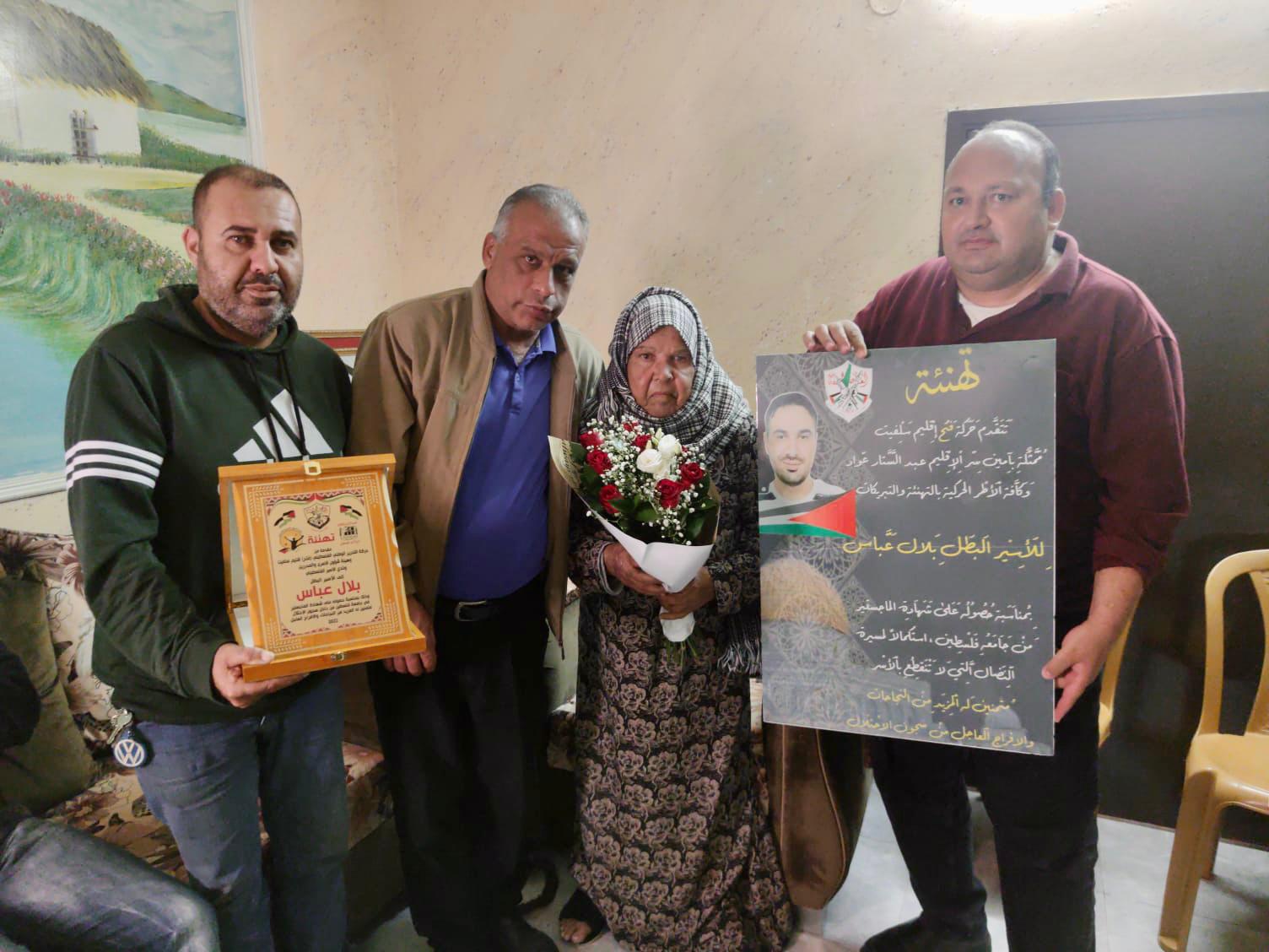 سلفيت 23-10-2022 وفا- كرمت حركة "فتح"، ونادي الأسير، وهيئة شؤون الأسرى والمحررين، وبلدية سلفيت، اليوم الأحد، عائلة الأسير بلال عباس من مدينة سلفيت، لحصوله على شهادة الماجستير من جامعة فلسطين، داخل سجون الاحتلال .