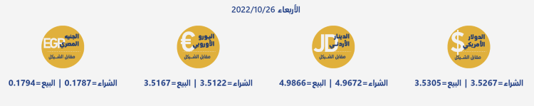 رام الله 26-10-2022 وفا- جاءت أسعار العملات مقابل الشيقل الإسرائيلي، اليوم الأربعاء، حسب سلطة النقد، على النحو التالي: