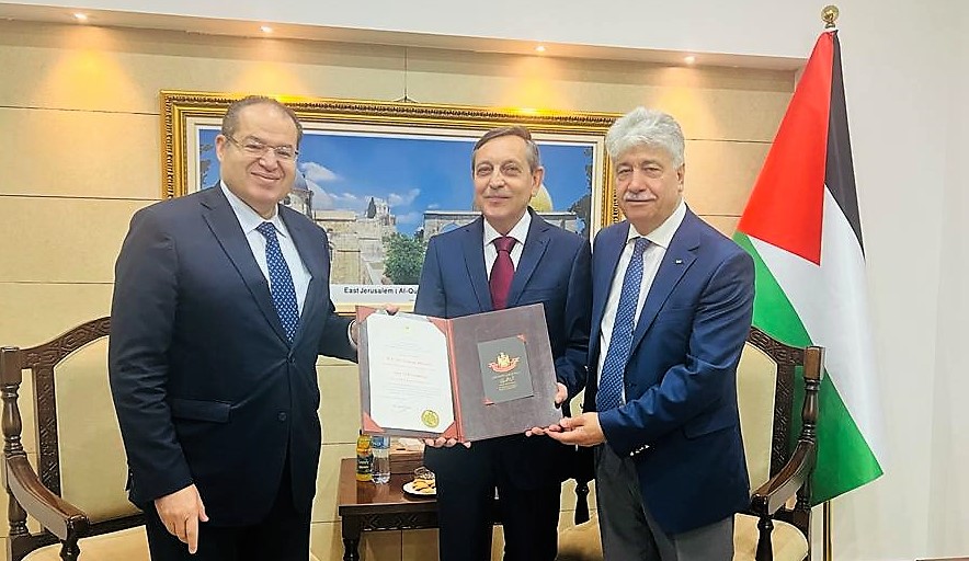 ومنح سيادته، ممثل جمهورية بلغاريا، نجمة الصداقة، تقديرا لدوره المتميز في تعزيز العلاقات بين فلسطين وبلغاريا، وتثمنيا لجهوده في دعم الشعب الفلسطيني ونصرة قضيته العادلة لنيل حريته واستقلاله.