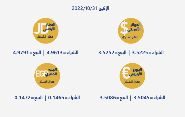 رام الله 31-10-2022 وفا- جاءت أسعار صرف العملات مقابل الشيقل "الإسرائيلي"، اليوم الاثنين، حسب سلطة النقد، على النحو التالي: