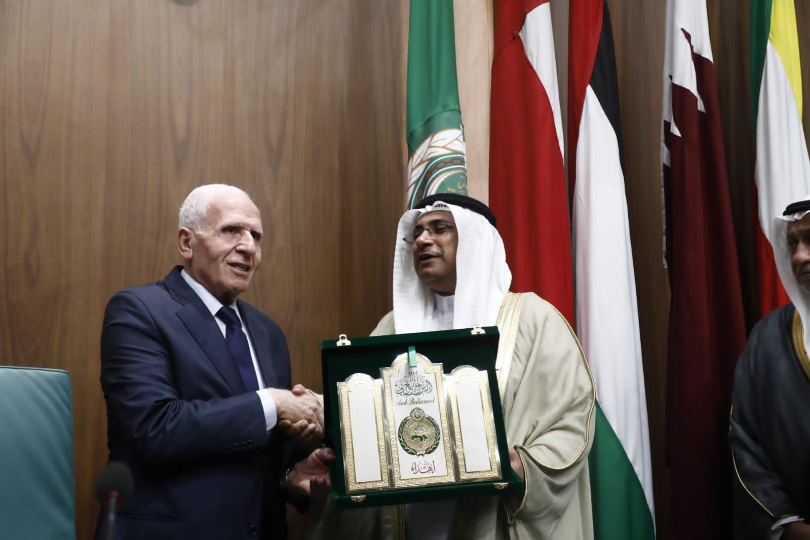القاهرة 4-10-2022 وفا- كرّم رئيس البرلمان العربي عادل العسومي، عضو اللجنة التنفيذية لمنظمة التحرير والمركزية لحركة فتح عزام الأحمد، بدرع البرلمان العربي وذلك تقديرا لجهوده الوطنية ودعمه للعمل العربي المشترك.