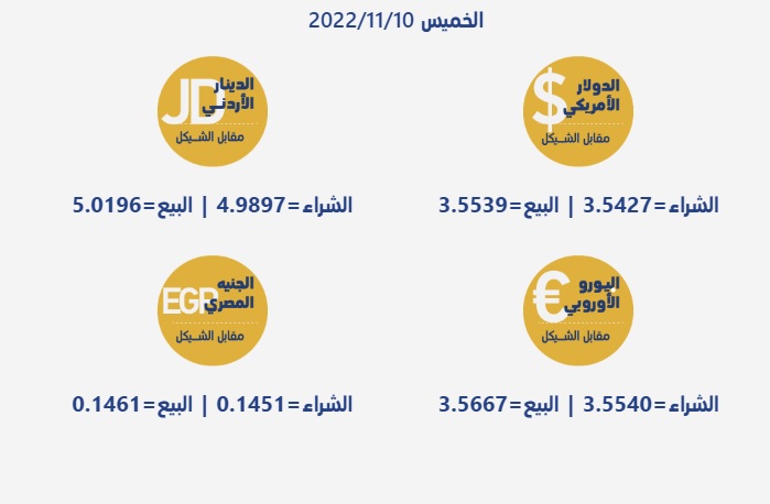رام الله 10-11-2022 وفا- جاءت أسعار العملات مقابل الشيقل الإسرائيلي، اليوم الخميس، حسب سلطة النقد، على النحو التالي: