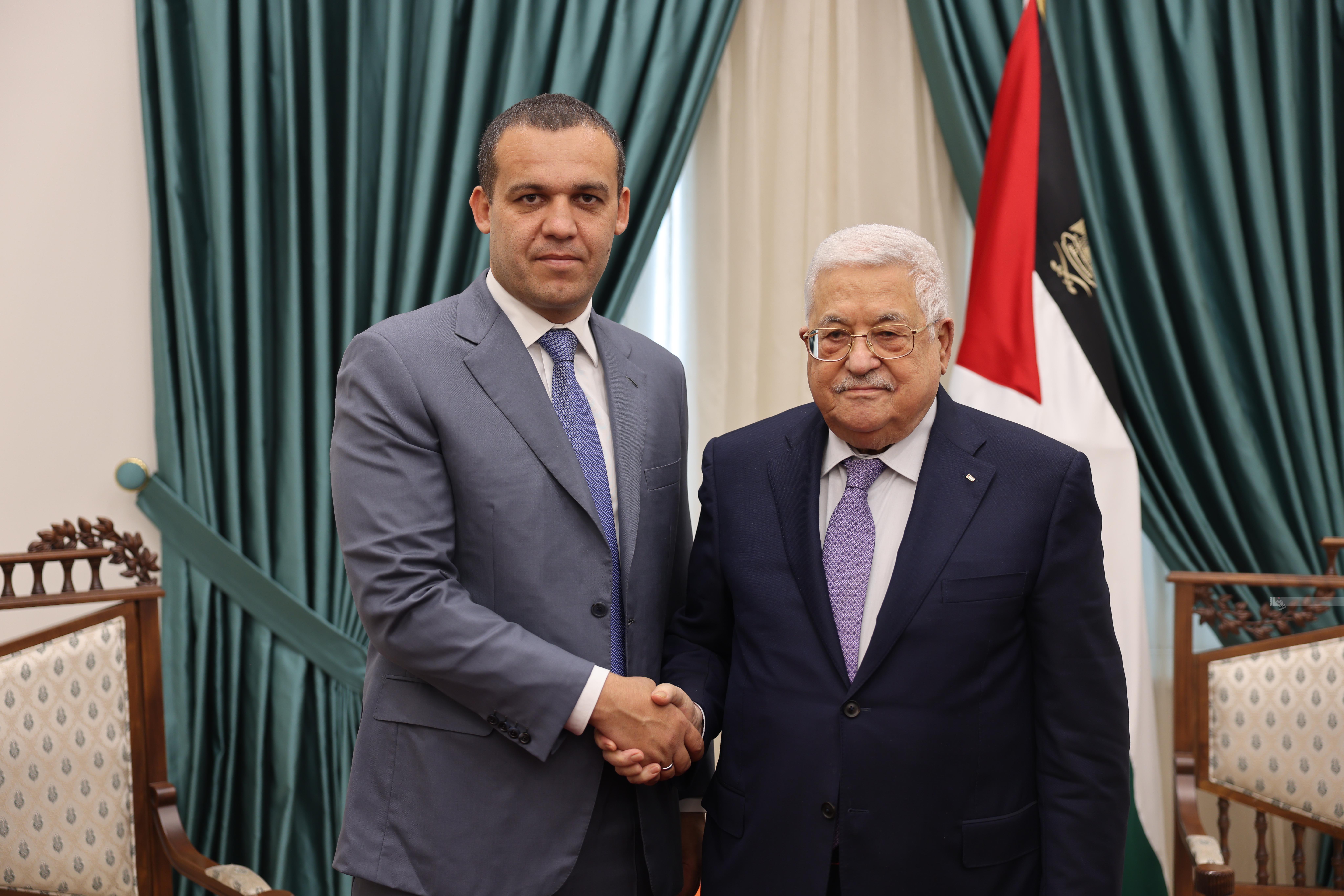 رام الله 12-11-2022 وفا- استقبل رئيس دولة فلسطين محمود عباس، اليوم السبت، رئيس الاتحاد الدولي للملاكمة عمر كريمليف، في مقر الرئاسة بمدينة رام الله، بحضور رئيس اللجنة الأولمبية الفلسطينية الفريق جبريل الرجوب.