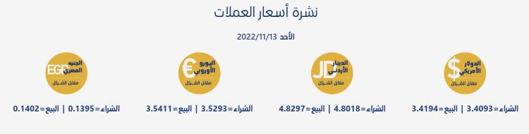 رام الله 13-11-2022 وفا- جاءت أسعار العملات مقابل الشيقل الإسرائيلي، اليوم الأحد، حسب سلطة النقد، على النحو التالي: