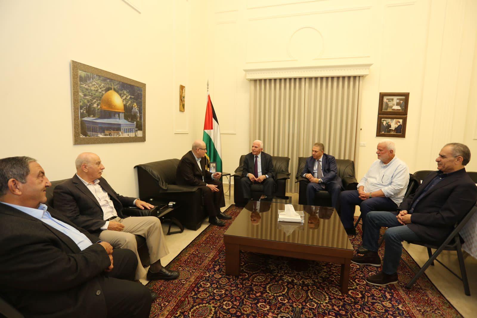 وجرى خلال اللقاء البحث في اعتداءات الاحتلال الإسرائيلي ومستوطنيه المستمرة على أبناء شعبنا ومقدساته الإسلامية والمسيحية، خاصة في مدينة القدس، وعلى مدننا وقرانا ومخيماتنا، ومحاولات تهويد المسجد الأقصى وتقسيمه زمانيا ومكانيا، وخطورة المخطط الصهيوني باستهداف المشروع الوطني الفلسطيني، ما يتطلب تعزيز الجهود لتوحيد الصف الوطني وإنهاء الانقسام، وترتيب البيت الفلسطيني لمواجهة الاحتلال والتصدي لمشاريعه العدوانية.