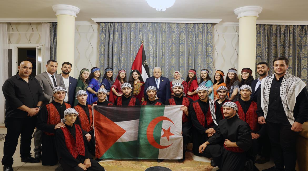الجزائر 2-11-2022 وفا- استقبل رئيس دولة فلسطين محمود عباس، في مقر إقامته في العاصمة الجزائرية، فرقة بيسان للفنون الشعبية الفلسطينية.