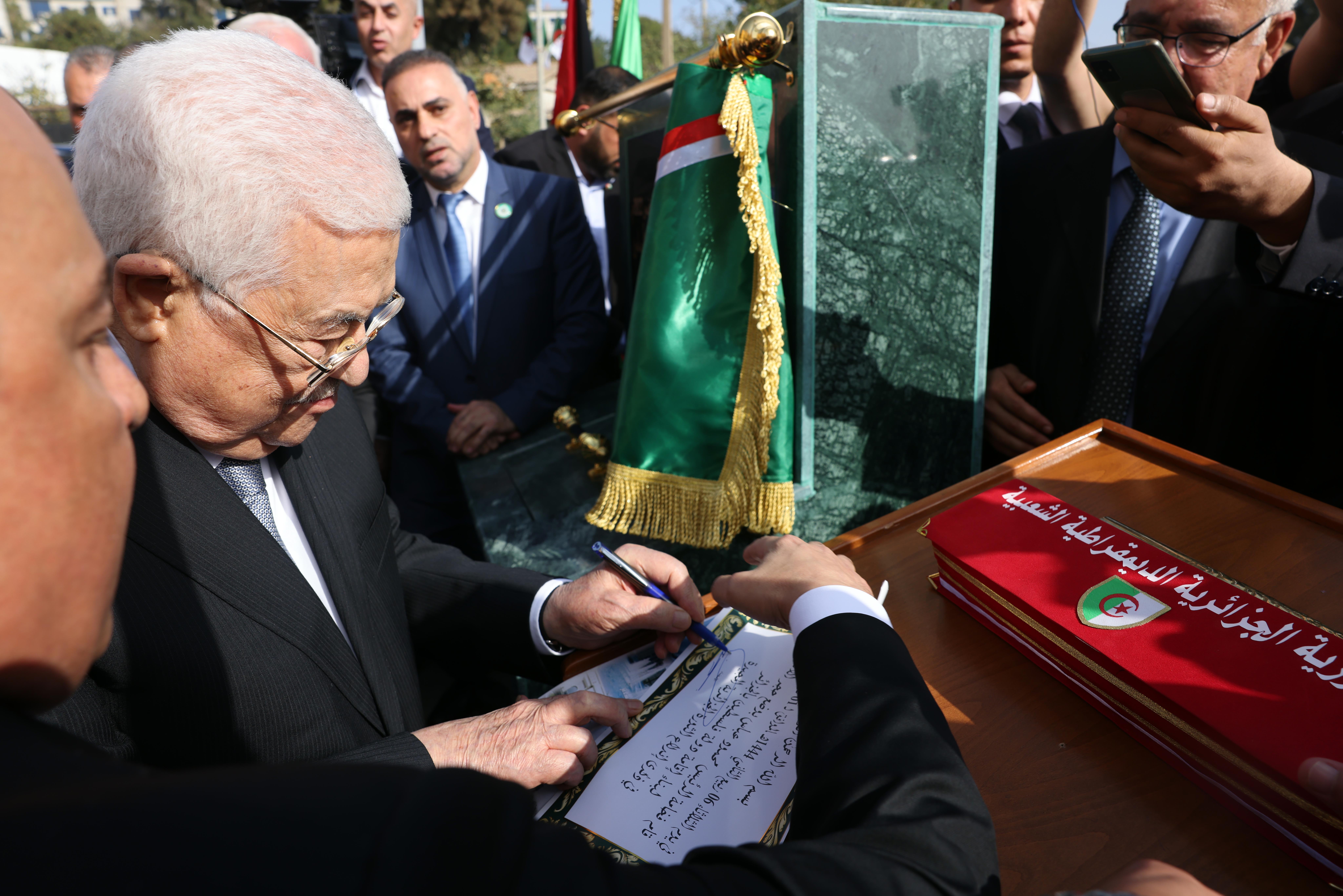 الجزائر 2-11-2022 وفا- وضع رئيس دولة فلسطين محمود عباس، اليوم الأربعاء، حجر الأساس لمقر الإقامة في سفارة دولة فلسطين لدى الجمهورية الجزائرية الديمقراطية الشعبية الشقيقة.