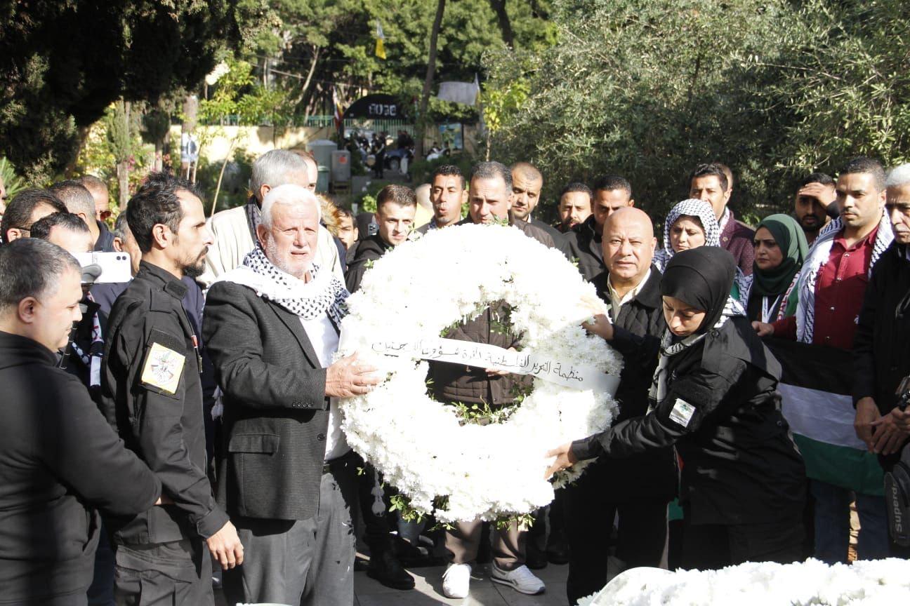 وقرأ المشاركون الفاتحة ووضعوا أكاليل من الزهور على النصب التذكاري لشهداء الثورة الفلسطينية، باسم الرئيس محمود عباس، ودائرة شؤون اللاجئين والملتقى الثقافي، واللجنة الوطنية الفلسطينية.