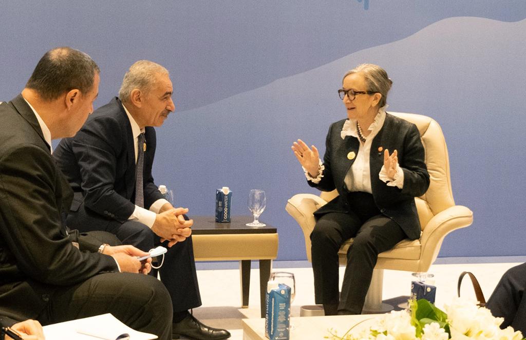 شرم الشيخ 8-11-2022 وفا- التقى رئيس الوزراء محمد اشتية، اليوم الثلاثاء، برئيسة وزراء الجمهورية التونسية نجلاء بودن، على هامش قمة المناخ (COP27) التي تعقد في شرم الشيخ بمصر، وذلك بحضور سفير دولة فلسطين لدى مصر، مندوبها الدائم لدى الجامعة العربية دياب اللوح.