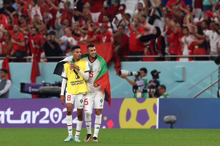 ورفع لاعبو المنتخب المغربي والجماهير العربية والمغربية الحاضرة في المدرجات، العلم الفلسطيني، إلى جانب العلم المغربي، خلال احتفالهم بالتأهل.