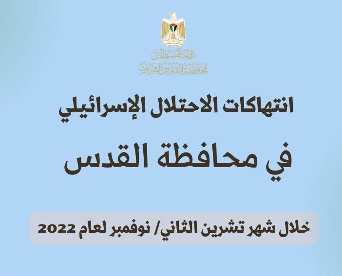 القدس 1-12-2022 وفا- أصدرت وحدة العلاقات العامة والإعلام في محافظة القدس، اليوم الخميس، تقريرها الشهري حول انتهاكات الاحتلال الإسرائيلي في المحافظة خلال شهر تشرين الثاني المنصرم، لخصت فيه مجمل الانتهاكات التي رُصدت في أحياء وبلدات المحافظة.