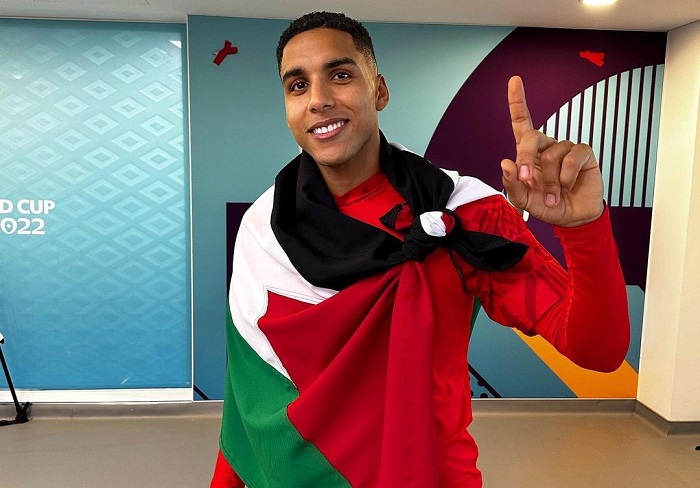نجم المنتخب المغربي عبد الحميد صابري متوشحا بالعلم الفلسطيني احتفالا بالتأهل