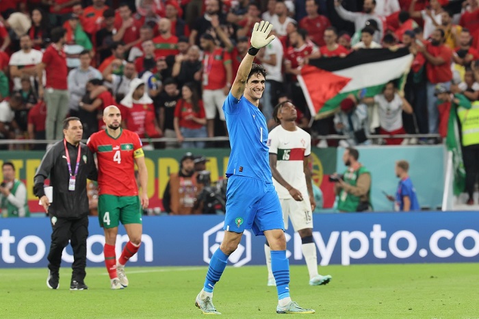 حارس عرين المنتخب المغربي ياسين بونو وخلفه الجماهير ترفع العلم الفلسطيني في المدرجات
