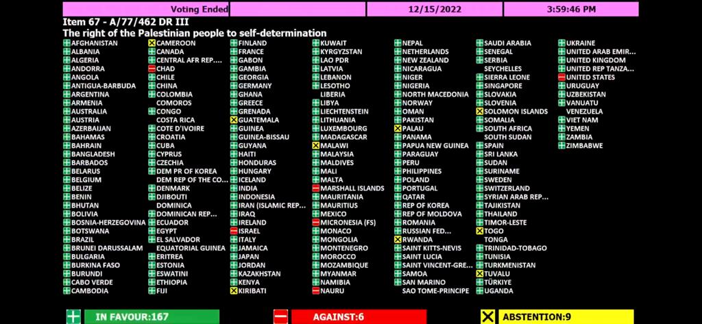 نيويورك 16-12-2022 وفا- اعتمدت الجمعية العامة للأمم المتحدة، بأغلبية ساحقا، مساء أمس، قرار حق الشعب الفلسطيني في تقرير مصيره.