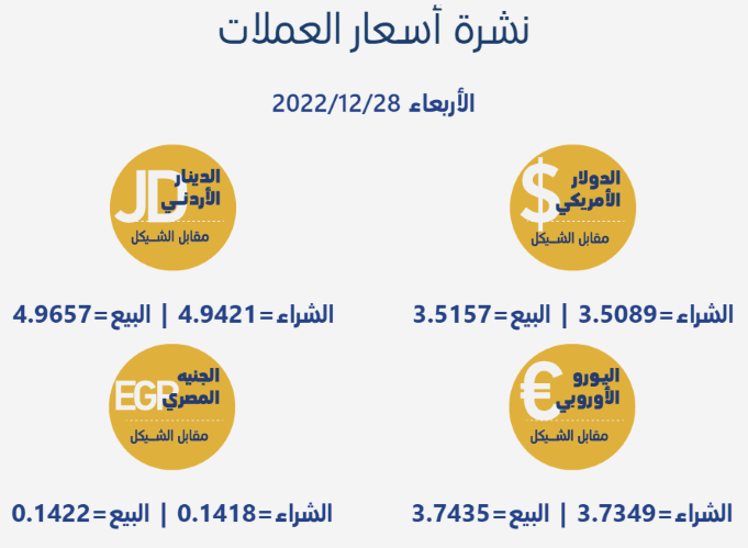 رام الله 28-12-2022 وفا- جاءت أسعار العملات مقابل الشيقل الإسرائيلي، اليوم الاربعاء، حسب سلطة النقد، على النحو التالي: