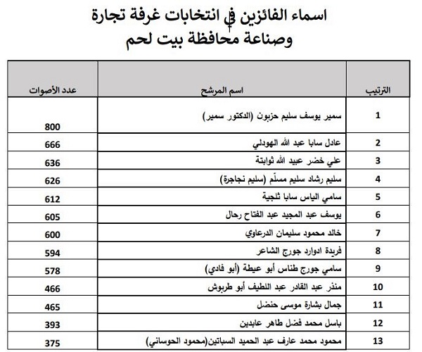 بيت لحم 3-12-2022 وفا- أعلنت اللجنة المركزية لإدارة انتخابات الغرف التجارية الصناعية، مساء اليوم السبت، أسماء الفائزين في انتخابات غرفة تجارة وصناعة محافظة بيت لحم.