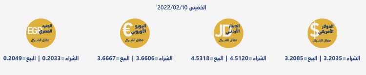 رام الله 10-2-2022 وفا- جاءت أسعار العملات مقابل الشيقل الإسرائيلي، اليوم الخميس، حسب سلطة النقد، على النحو التالي: