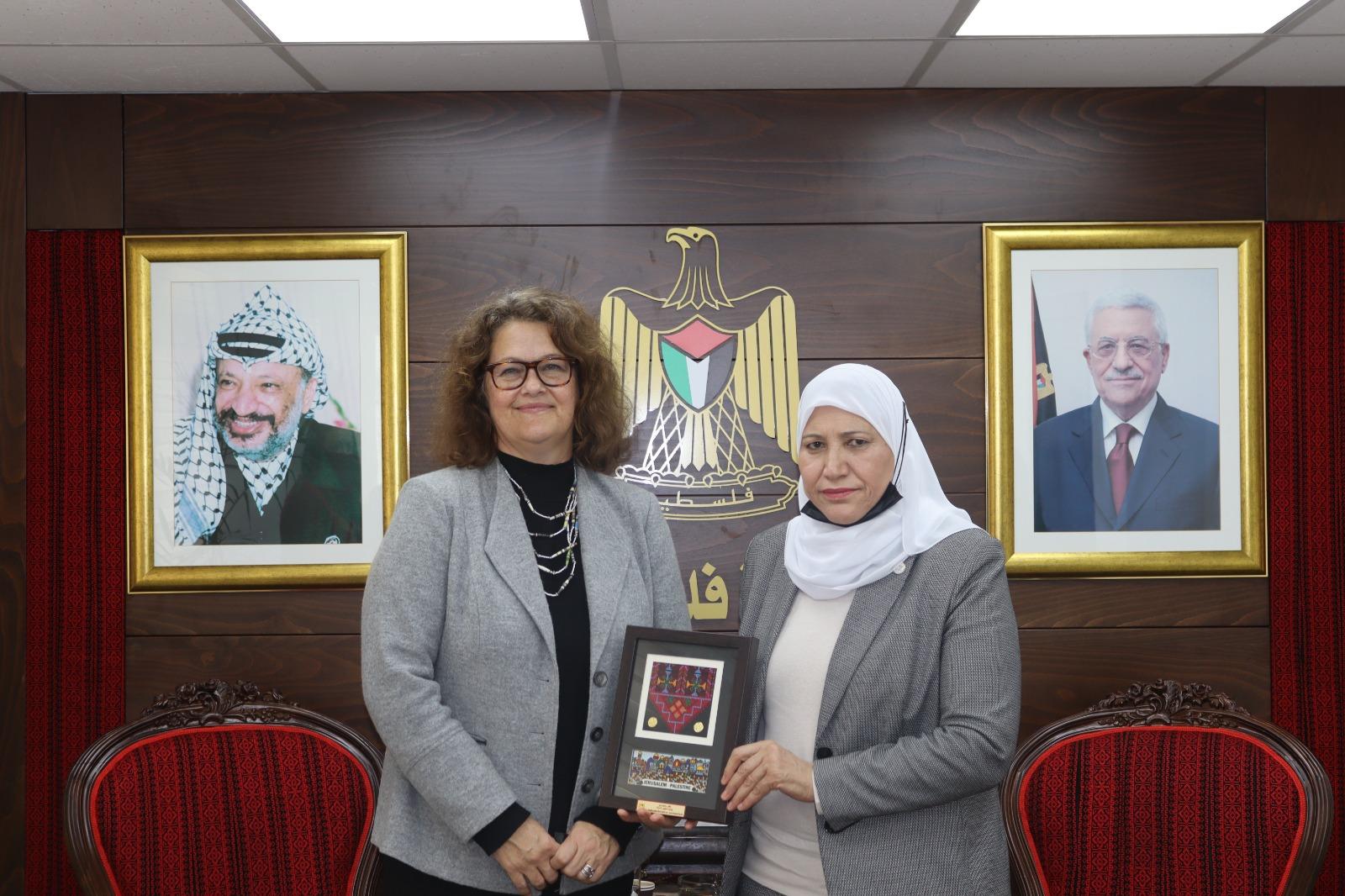 رام الله 15-2-2022 وفا- بحثت وزيرة شؤون المرأة آمال حمد مع مديرة مشاريع التعاون الكندي كاثرين بالمير والوفد المرافق لها، اليوم الثلاثاء، في مقر الوزارة برام الله، آليات التعاون والعمل المستقبلي في قضايا النوع الاجتماعي.