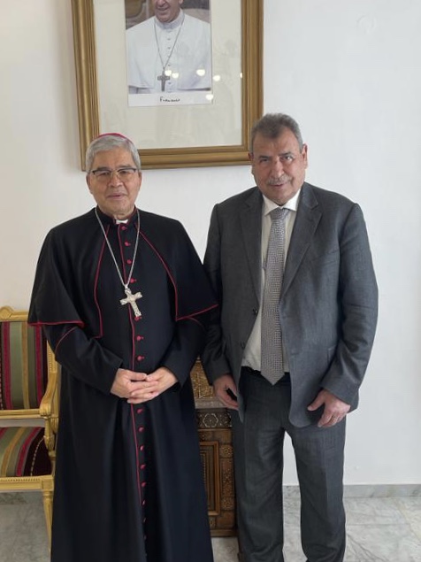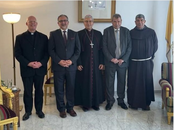 القدس 21-2-2022 وفا- التقى عضو اللجنة التنفيذية لمنظمة التحرير الفلسطينية، رئيس اللجنة الرئاسية العليا لمتابعة شؤون الكنائس في فلسطين رمزي خوري، اليوم الإثنين، مع القاصد الرسولي، كبیر الأساقفة أدولفو نینو، في مقر القصادة، بحضور عضو اللجنة سفیر دولة فلسطين لدى حاضرة الفاتیكان عیسى قسیسیة، ومستشار حراسة الأراضي المقدسة الأب إبراھیم فلتس، والمونسنیور توماس غریشا.