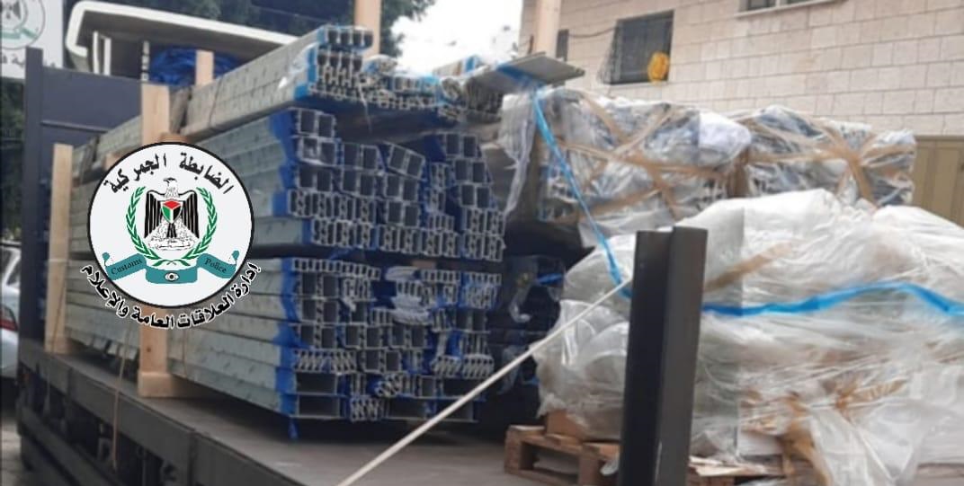 قلقيلية 21-2-2022 وفا- ضبط جهاز الضابطة الجمركية، مساء اليوم الإثنين، في محافظة قلقيلية، شاحنة تحمل لوحة تسجيل إسرائيلية محملة بـ 2800 كيلوغرام من الألمنيوم إنتاج المستوطنات الممنوع من التداول بالأسواق الفلسطينية.