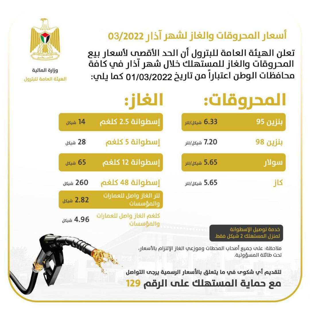 وبينت في بيان لها، اليوم الاثنين، أن لتر البنزين 95 سيباع بـ6.33 شيقل، ولتر البنزين 98 بـ27. 7 شيقل، ولتر السولار والكاز بـ5.65 شيقل، واسطوانة الغاز 12 كيلوغراما بـ 65 شيقلا.