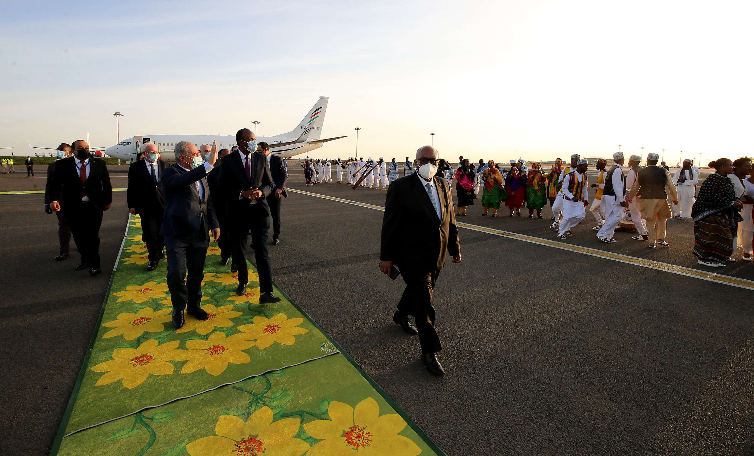 وكان في استقبال رئيس الوزراء لدى وصوله، وزير الطاقة والمياه الإثيوبي هابتامو إيتيفا، وسفير دولة فلسطين لدى جمهورية أثيوبيا الإتحادية فارس القب.