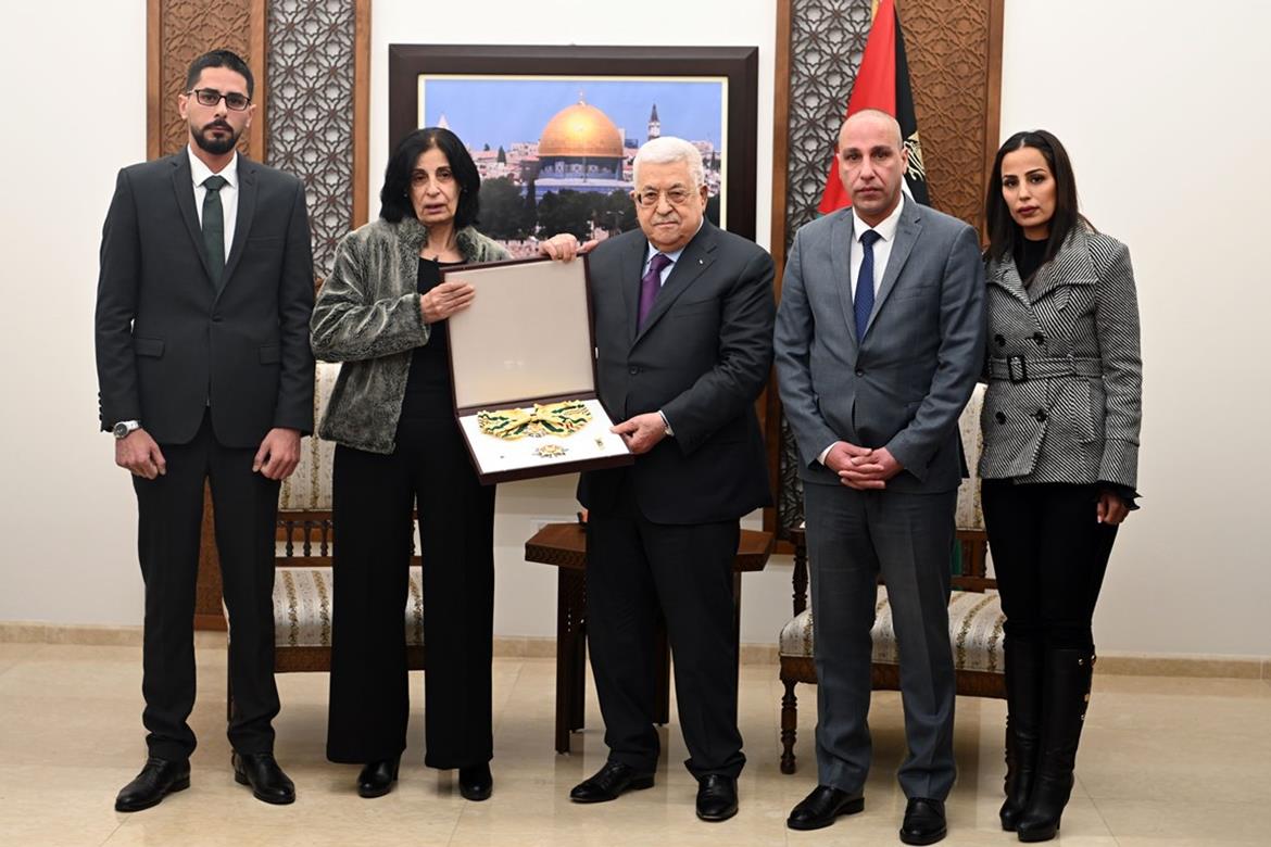 رام الله 14-3-2022 وفا- منح رئيس دولة فلسطين محمود عباس القائد الوطني الراحل عبد الرحيم ملوح وسام نجمة الشرف من الدرجة العليا.