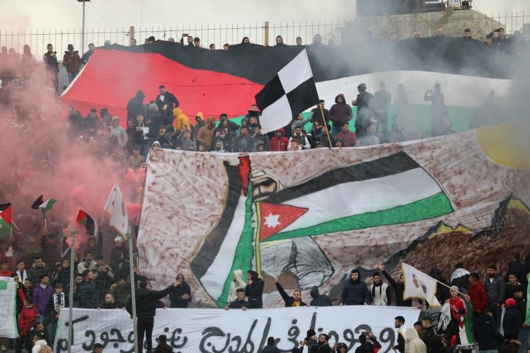 وتزينت مدرجات إستاد هواري بو مدين بالعلمين الفلسطيني والأردني، وهتفت الجماهير باسم الفريقين، ورددوا الشعارات التي تؤكد وحدة الشعبين الفلسطيني والأردني.