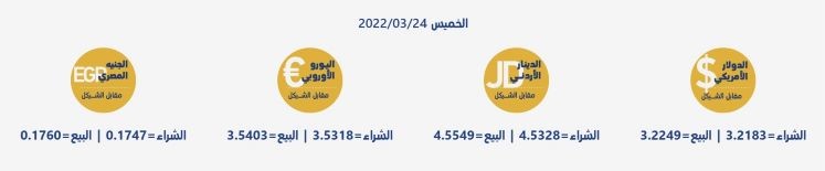 رام الله 24-3-2022 وفا- جاءت أسعار العملات مقابل الشيقل الإسرائيلي، اليوم الخميس، حسب سلطة النقد، على النحو التالي: