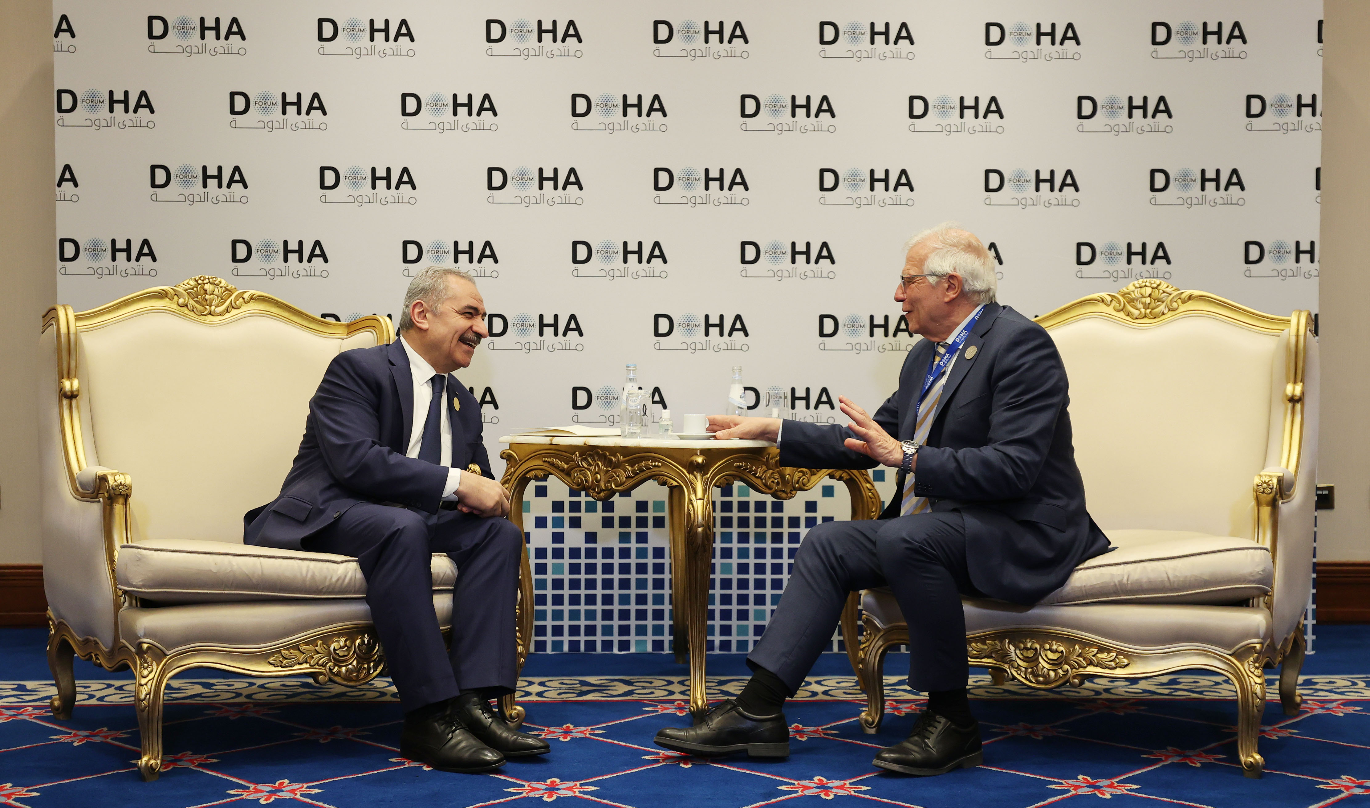 وقال رئيس الوزراء لدى لقائه بوريل على هامش مشاركته بمنتدى الدوحة: "نقدر عاليا وقوف أوروبا جانب فلسطين سياسيا لحماية القانون الدولي وحقوق الشعب الفلسطيني وإنهاء الاحتلال عن أراضينا، وفي تجسيد بناء الدولة ومؤسساتها، والوقوف الى جانب السلام والعدالة".