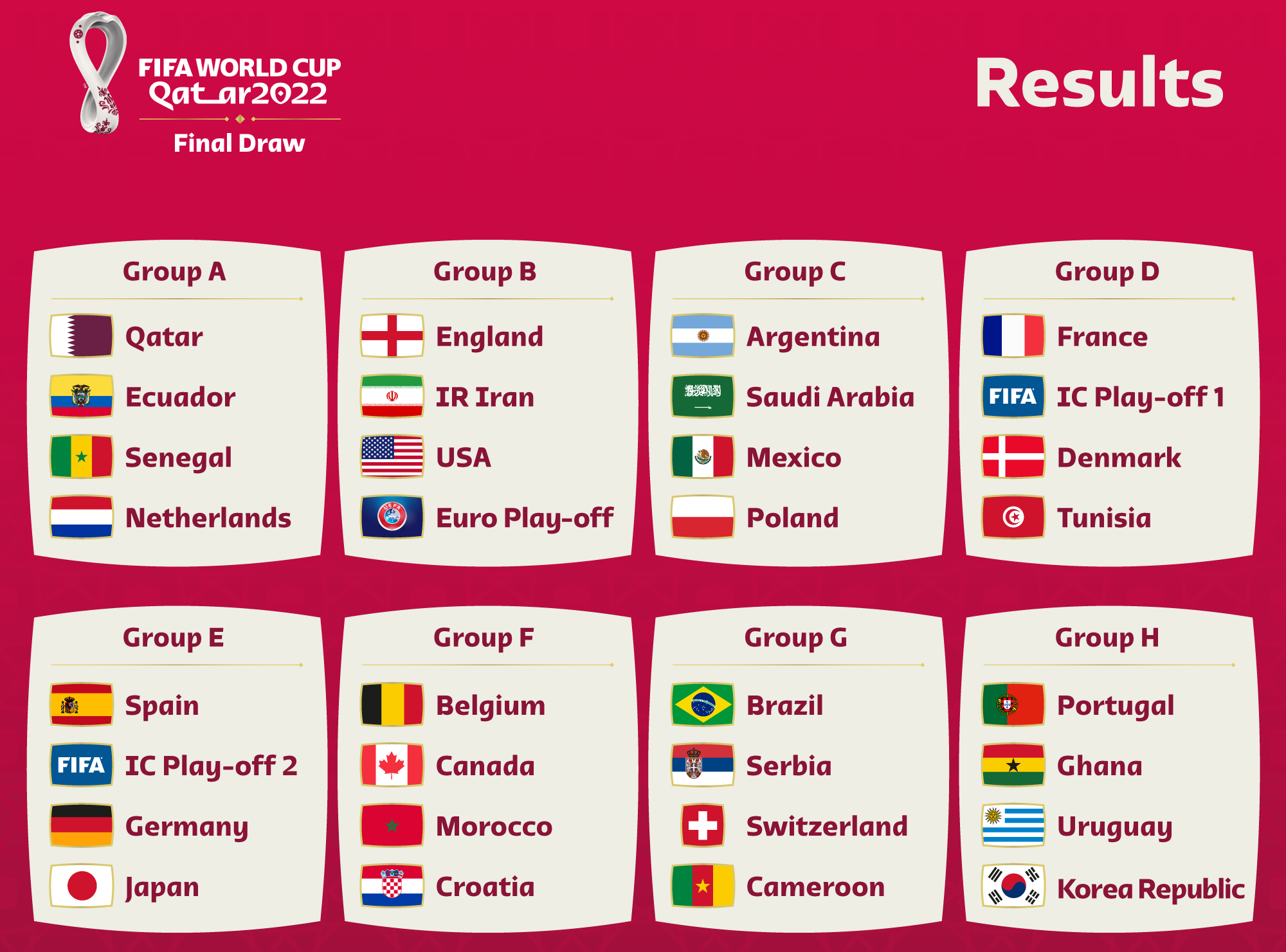 وأوقعت القرعة المنتخب القطري المستضيف في مواجهة الإكوادور والسنغال وهولندا ضمن المجموعة الأولى، في حين تواجه السعودية منتخبات الأرجنتين والمكسيك وبولندا في المجموعة الثالثة، وتصطدم تونس مع حامل اللقب فرنسا والدنمارك، في حين تواجه المغرب منتخبات بلجيكا وكرواتيا وكندا.